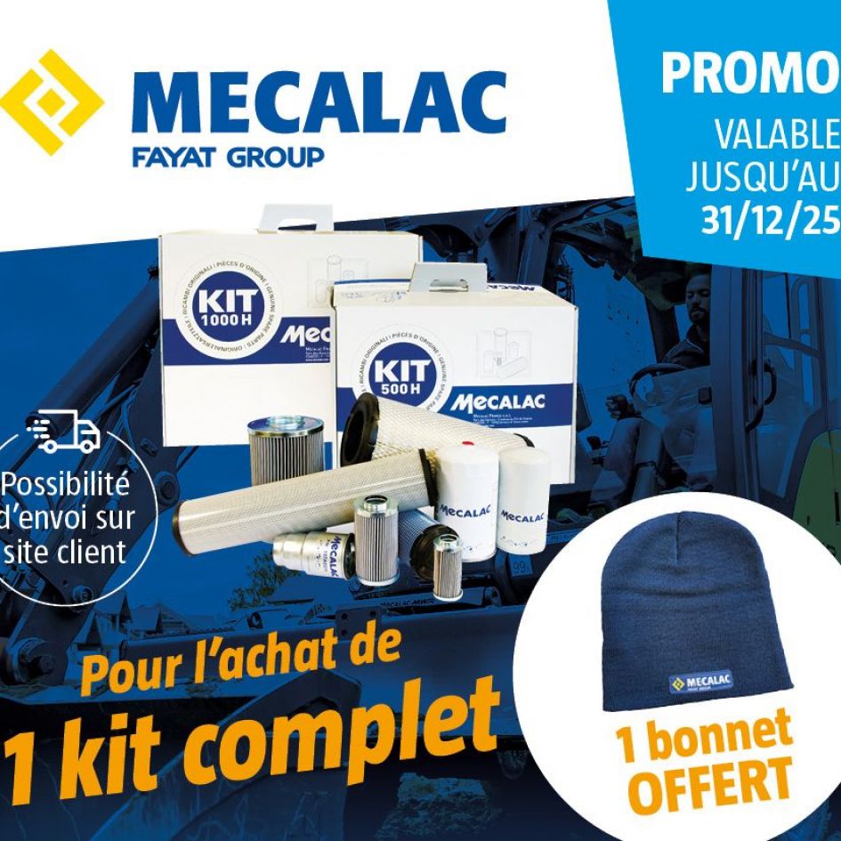 Pour l'achat d'un kit filtre complet Mecalac, nous vous offrons un bonnet Mecalac Offre Spéciale Mecalac : Kit filtre Complet + Bonnet Offert !